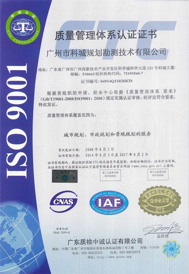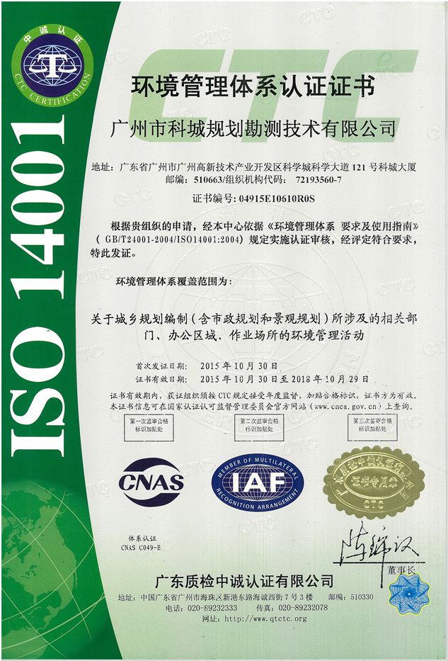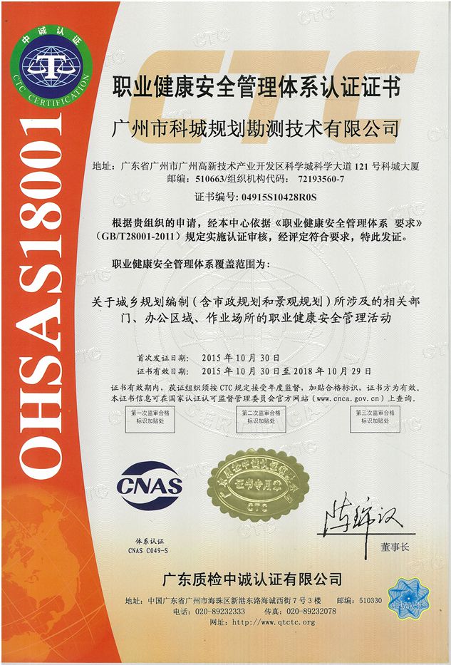 2015年10月,科城|科美設(shè)計(jì)集團(tuán)下轄廣州市科城規(guī)劃勘測(cè)技術(shù)有限公司榮獲高新技術(shù)企業(yè)職業(yè)健康安全管理體系認(rèn)證證書、環(huán)境管理體系認(rèn)證證書。至此,科城規(guī)劃“三標(biāo)一體”(ISO9001認(rèn)證、 ISO14001認(rèn)證、OHSAS18001認(rèn)證)體系建設(shè)完成。